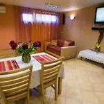 Willa oferuje między innymi czajnik elektryczny i lodówkę do samodzielnego przygotowywania posiłków. Specjały kuchni europejskiej serwowane są w restuaracji Express Pizza, która znajduje się w niewielkiej odległości od willi. 10-pokojowa willa leży 10 min pieszo od dworca autobusowego Pirtis.